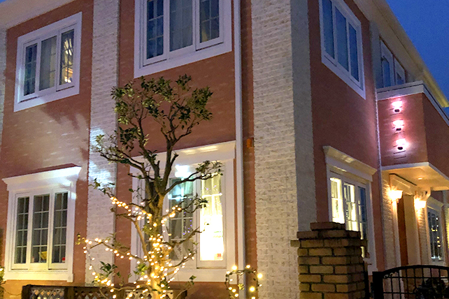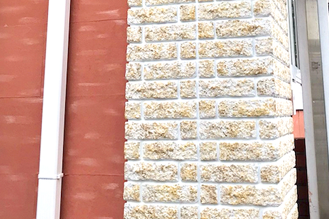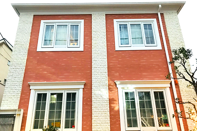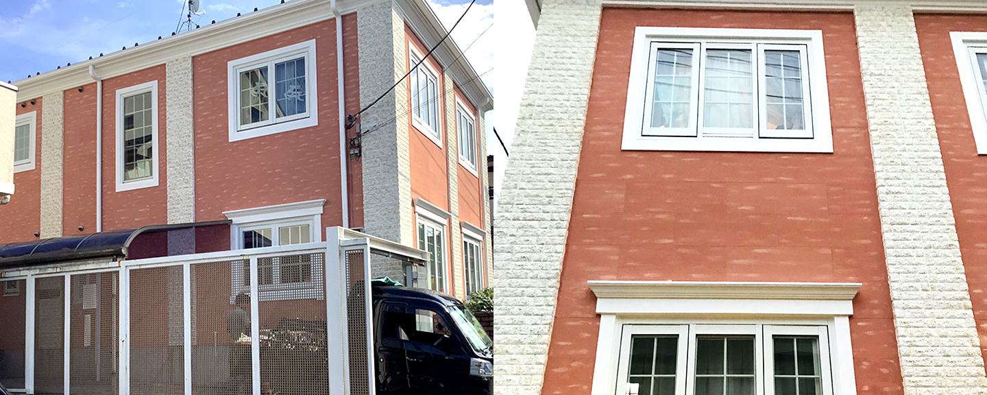 ベネチア風の多色外壁と白目地エイジングタイル調、白色モールディングに仕上げ ALC壁のシール目地があるbeforeから石積、大壁塗りのafterになり上質感のある 外装(建物)に替わりました。