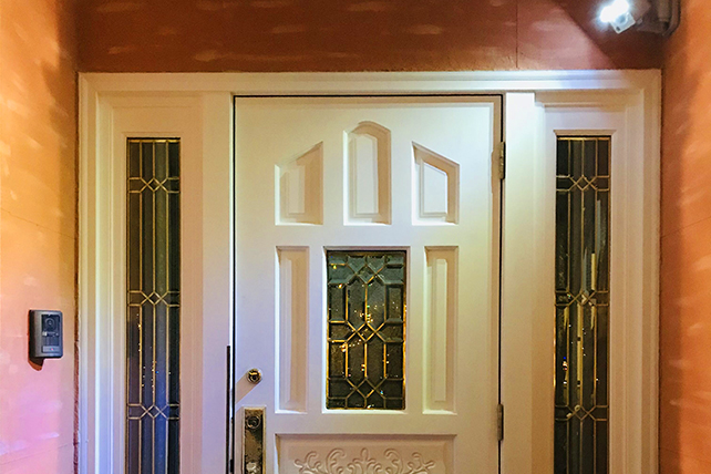 輸入木製玄関ドアの傷み塗膜の剥がれが顕著なためOS調に復元塗装でなく 木目を平滑にするため、下地目止め処理後、ウレタンスプレーにて仕上げました。